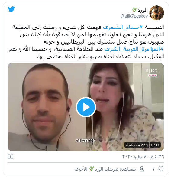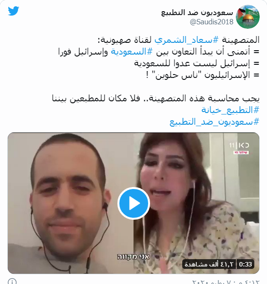 أصبح كيل المديح للكيان الاسرائيلي المحتل سياسة علنية وصريحة لاتباع سلطات الرياض فقد اقدمت ناشطة وكاتبة سعودية بارزة على مدح (المحتلين الإسرائيليين) علنا، في مقابلة أجرتها مع قناة “كان” العبرية الرسمية، بحسب ما نقله إعلاميون إسرائيليون وناشطون عبر مواقع التواصل.