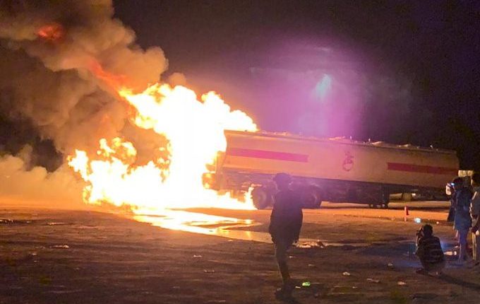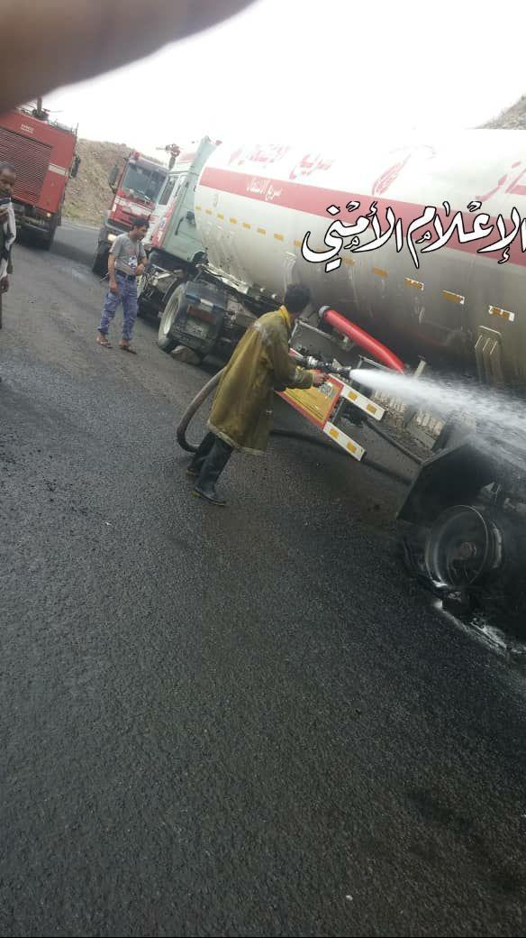 شاهد الدفاع المدني يسيطر على حريق قاطرة محملة بالغاز جنوب غرب العاصمة صنعاء (صورة)