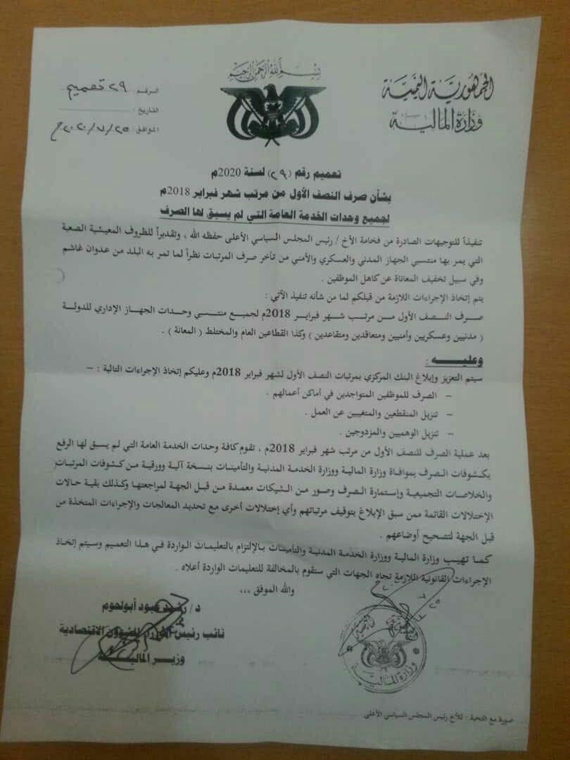 بالوثيقة.. تعميم هام وعاجل من وزارة المالية في صنعاء بشأن صرف نصف راتب لجميع موظفي الدولة