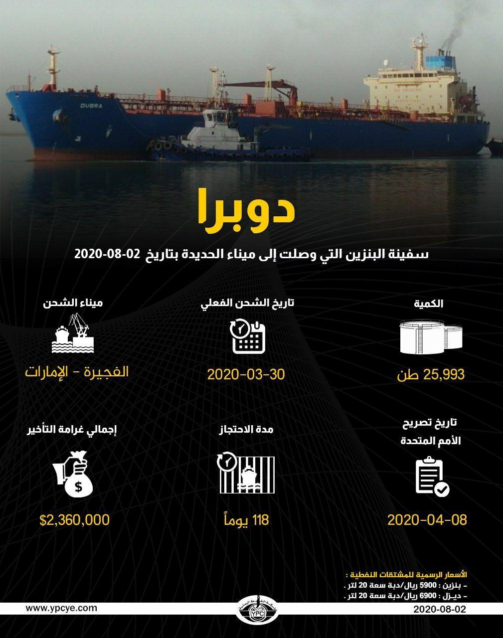 قالت شركة النفط اليمنية إن السفينة (دوبرا) التي وصلت اليوم الأحد إلى ميناء الحديدة والتي تحمل 25 ألف و993 طن من مادة البنزين، لا تغطي احتياج المواطنين من هذه المادة سوى لخمسة أيام.