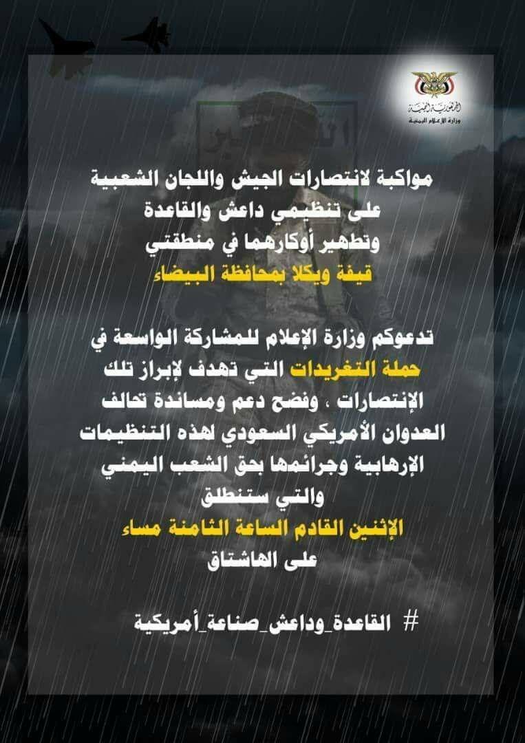 دعت وزارة الإعلام اليمنية في صنعاء، جميع المواطنين للمشاركة في حملة التغريدات الواسعة على موقع التواصل الإجتماعي “تويتر”، مواكبةً لانتصارات الجيش واللجان الشعبية على تنظيمي داعش والقاعدة وتطهير أوكارهما في منطقتي قيفة ويكلا بمحافظة البيضاء.