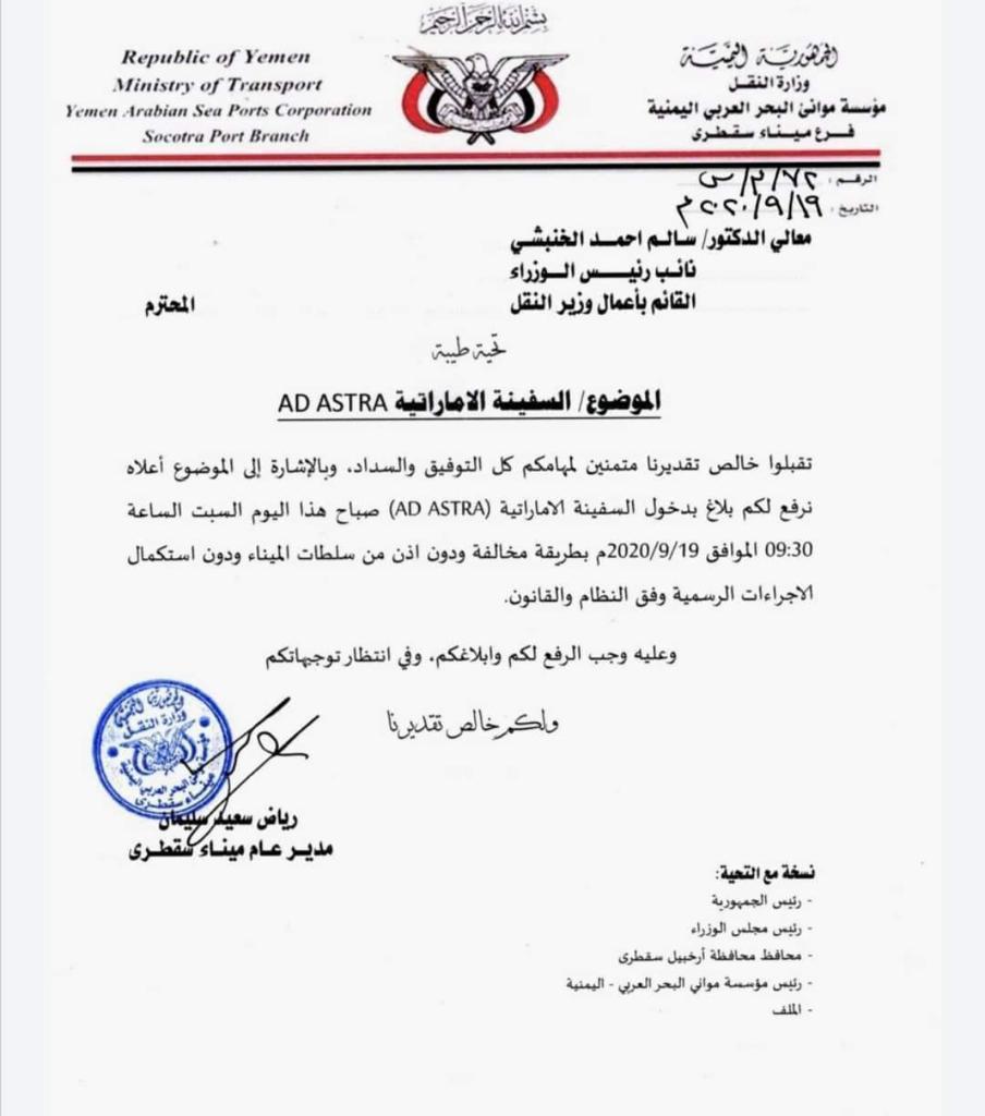 وكشفت مذكرة رسمية رفعها مدير عام ميناء سقطرى رياض سعيد سليمان، إلى القائم بأعمال وزير النقل في حكومة المرتزقة عن دخول “السفينة الإماراتية (AD ASTRA)، امس السبت الى رصيف ميناء سقطرى بطريقة مخالفة دون إذن من سلطات الميناء، ودون استكمال الإجراءات الرسمية وفق النظام والقانون”.