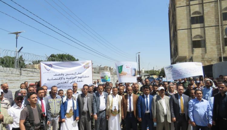 وجددت وزارة الزراعة استنكارها لاستمرار العدوان في ارتكاب المجازر بحق المدنيين واستهداف المنازل وتدمير البنية التحتية والمؤسسات المدنية ومحطات الوقود في ظل صمت وتواطؤ دولي .. لافتاً إلى أن تنظيم الوقفات الاحتجاجية للعاملين في القطاع الزراعي رسالة للعالم بصمود الشعب اليمني بمختلف فئاته وشرائحه ومزارعيه في وجه العدوان.