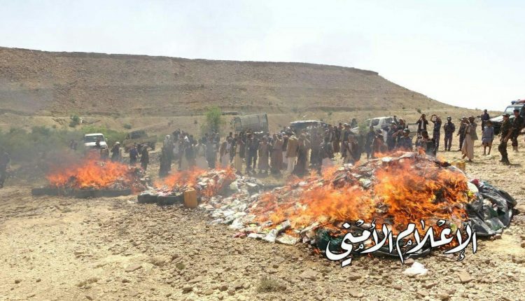 “شاهد” إتلاف أكثر من 12 طن من مادة الحشيش المخدر في صعدة