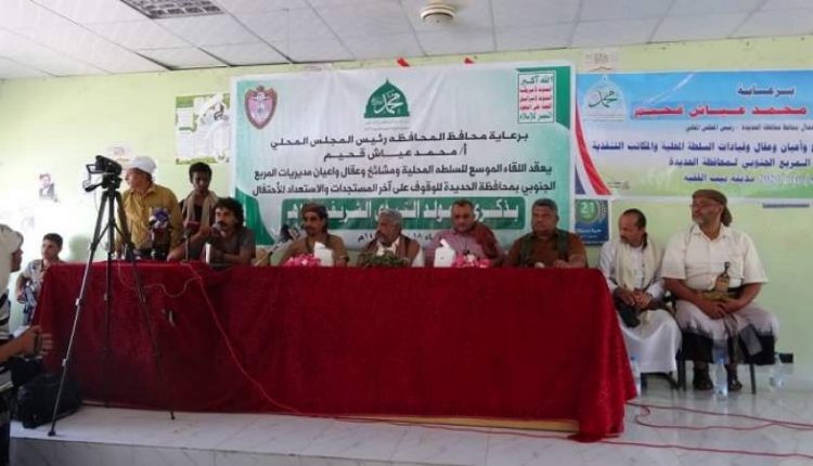 واستعرض اللقاء الذي ضم مشائخ وعقال وأعيان مديريات المربع الجنوبي بالمحافظة، الاستعدادات الجارية للاحتفال بذكرى المولد النبوي الشريف 1442هـ وترتيبات تسيير قافلة غذائية دعما للجيش واللجان الشعبية المرابطين في الجبهات.