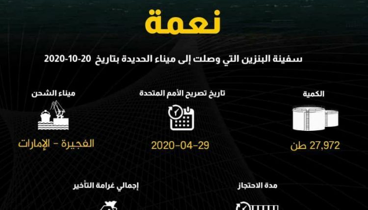 وأشار الخطيب إلى أن إجمالي غرامة التأخير على الناقلة المصرح لها بالدخول للميناء من قبل الأمم المتحدة في 29 أبريل الماضي بلغت ثلاثة ملايين و828 ألف دولار.