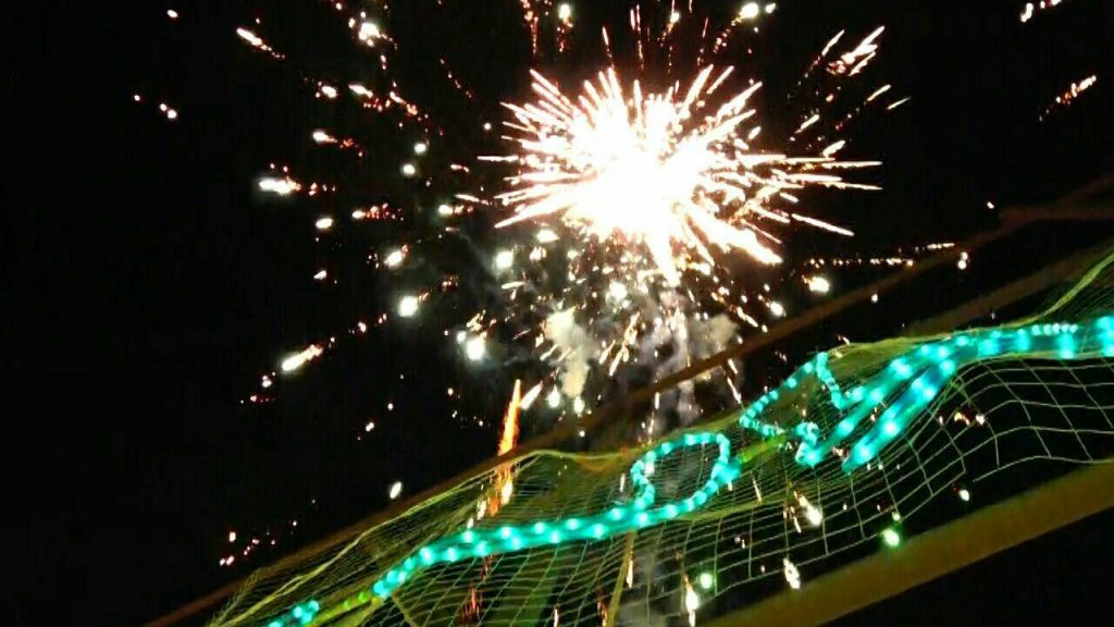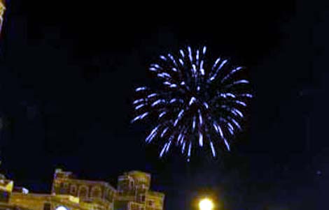 أطلقت الألعاب النارية في سماء العاصمة صنعاء احتفاء بذكرى المولد النبوي الشريف، فيما زينت الأضواء ساحة الاحتفال بميدان السبعين ومختلف الشوارع والأحياء.