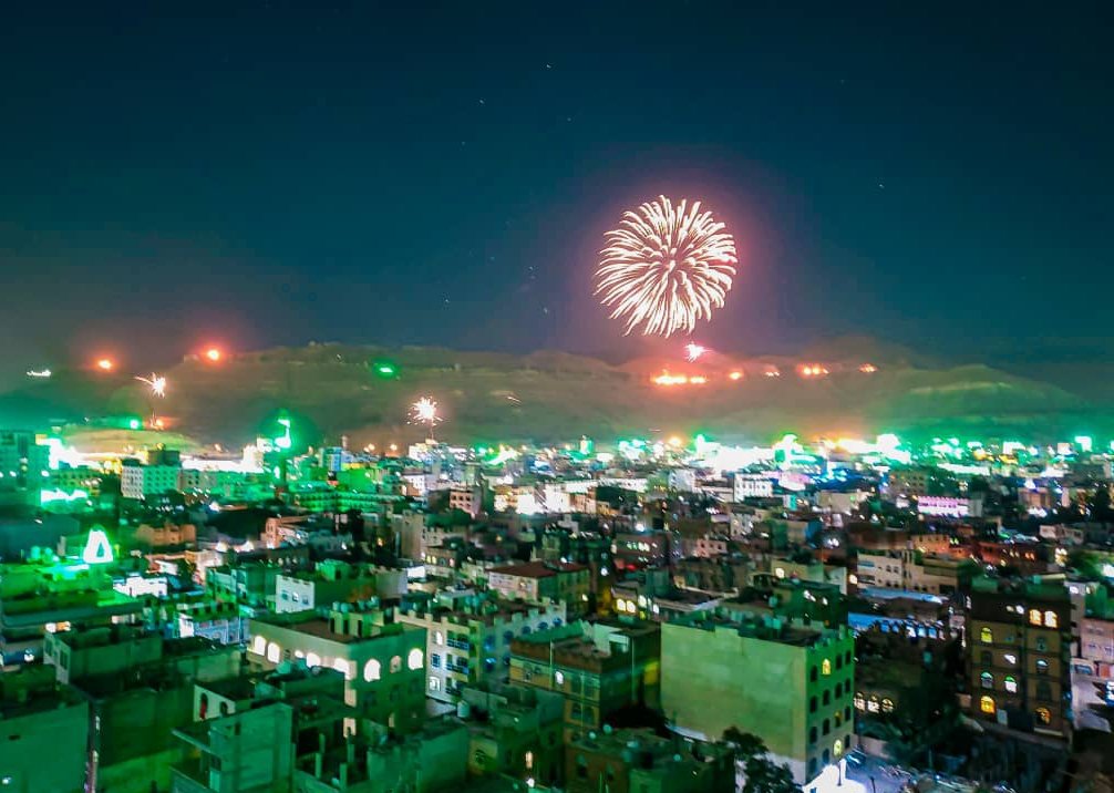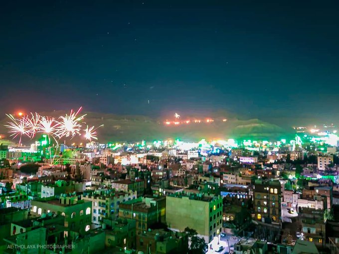 شاهد صنعاء قبل لحظات والألعاب النارية تضيء سماء العاصمة إحتفاءً وإبتهاجاً بالمولد النبوي (صور وفيديو)