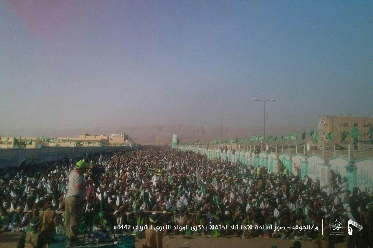 ورفعت الحشود الجماهيرية المشاركة في الحفل حضره وزير النفط والمعادن أحمد دارس ومحافظ الجوف عامر المراني وعضو مجلس النواب أحمد القرشي وعدد من أعضاء مجلس الشورى ووكلاء المحافظة ومدراء المكاتب التنفيذية والمديريات، ومشائخ ووجهاء المحافظة، ووفود من مديريات مدغل ومجزر ورغوان بمحافظة مأرب، اللافتات والشعارات المعبرة عن الفرحة والبهجة بهذه المناسبة الدينية الجليلة.
