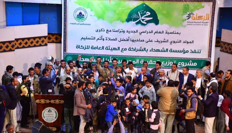دشنت مؤسسة الشهداء بالشراكة مع الهيئة العامة للزكاة اليوم بصنعاء، مشروع توزيع الحقيبة المدرسية على أبناء الشهداء والأيتام في عموم المحافظات بمناسبة العام الدراسي الجديد وبالتزامن مع ذكرى المولد النبوي الشريف.