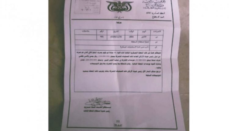 وجاء في وثيقة رسمية موجهة من شعبة الاستطلاع التابعة للمرتزقة في المنطقة إلى نائب رئيس دائرة الاستخبارات في مأرب, ان قائد المنطقة الثالثة ثوابة، استولى على 150 مليون ريال صرفت من رئيس هيئة أركان المرتزقة المدعو صغير بن عزيز.