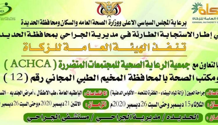 تدشن الهيئة العامة للزكاة بالتعاون مع جمعية الرعاية الصحية للمجتمعات المتضررة غداً الثلاثاء ،المخيم الطبي المجاني الـ12 في إطار الاستجابة الطارئة في مديرية الجراحي بمحافظة الحديدة تحت شعار “الزكاة في مصارفها”.