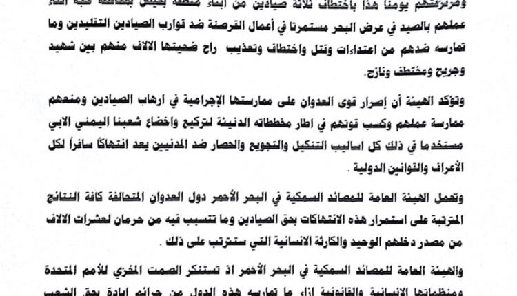 أدانت الهيئة العامة للمصائد السمكية في البحر الأحمر اختطاف قوات العدوان الأمريكي السعودي ومرتزقتها ثلاثة صيادين من أبناء منطقة بحيص محافظة حجة أثناء عملهم في عرض البحر.