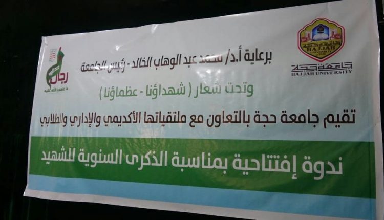 نظّمت جامعة حجة بالتنسيق مع الملتقيات الاكاديمية والإدارية والطلابية بالجامعة اليوم ندوة ثقافية بمناسبة الذكرى السنوية للشهيد.