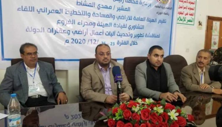 من جانبه حث رئيس الهيئة العامة للأراضي والمساحة والتخطيط العمراني القاضي عبدالعزيز العنسي، مدراء الفروع بتلافي جوانب القصور والعمل على إعداد الخطط والاستراتيجيات اللازمة لحفظ أراضي وممتلكات الدولة وأراضي المواطنين.