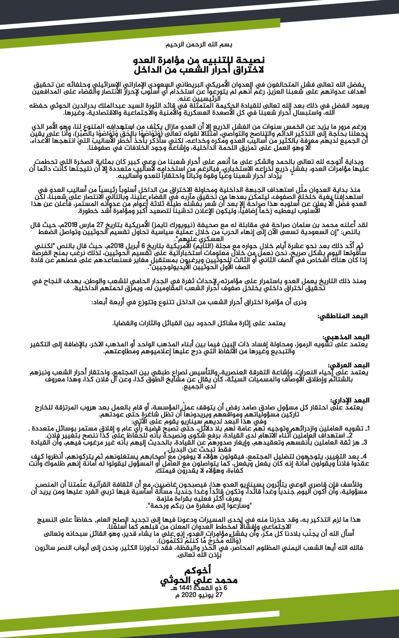 وأعاد الحوثي نشر وثيقة تنبيهية على صفحته في تويتر، كان قد نشرها بتاريخ 27 يونيو 2020م بعنوان: (نصيحة للتنبيه من مؤامرة العدو لإختراق أحرار الشعب من الداخل) والتي قال فيها، إنه “بفضل الله تعالى فشل المتحالفون في العدوان الأمريكي البريطاني السعودي الإماراتي الإسرائيلي وحلفائه عن تحقيق أهداف عدوانهم على شعبنا العزيز، رغم أنهم لم يتورعوا عن استخدام أي أسلوب لإحراز الانتصار والقضاء على المدافعين الرئيسيين عنه”.