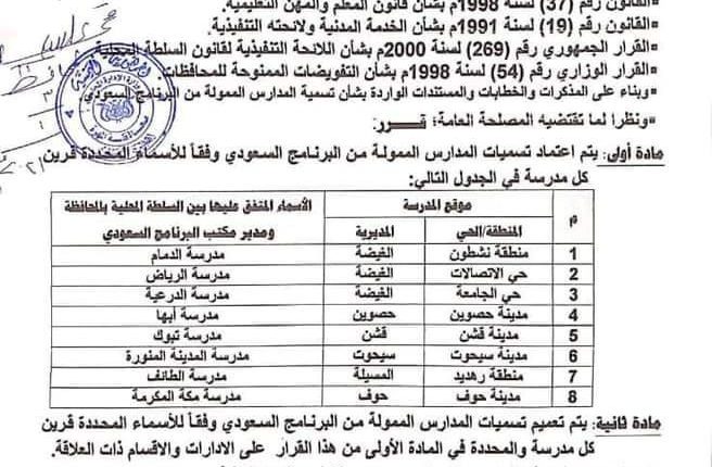 وحصل “يمني برس” على وثيقة  لما يسمى بالبرنامج السعودي اشترط فيها (ال جابر)على فرع مكتب التربية بالمحافظة تغيير أسماء ثمان مدارس قديمة متوزعة في المحافظة تم طلاؤها حديثا ببويا رنج من قبل البرنامج السعودي وزعمه لبناءها –  إلى أسماء مدن سعودية وإلغاء مسمياتها اليمنية والمهرية وتجريدها من الهوية اليمنية.