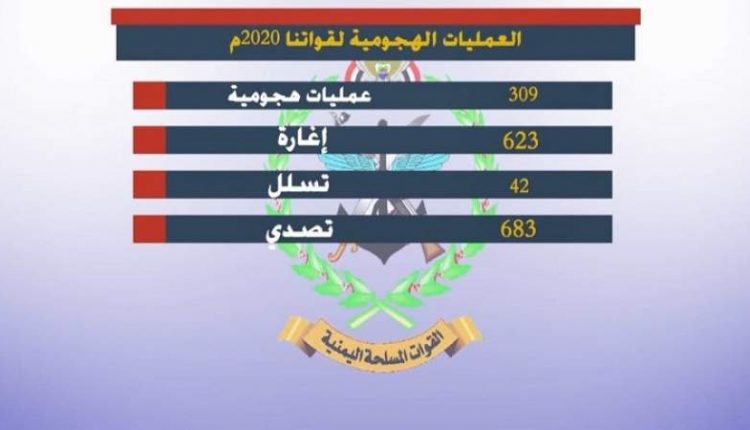 وأكد العميد يحيى سريع في مؤتمر صحفي له، اليوم الاثنين، عن حصاد العمليات العسكرية والإنجازات العسكرية لمختلف وحدات قواتنا المسلحة خلال العام 2020م، مؤكدا أن قواتنا نفذت أكثر من 974 عملية عسكرية منها: 309 عملية هجومية في مختلف الجبهات والمحاور القتالية، و 623 عملية إغارة، و42 عملية تسلل.