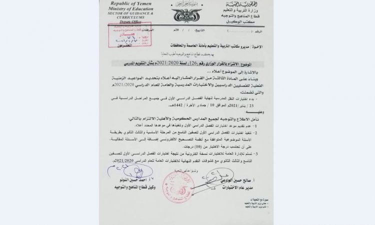 أصدرت وزارة التربية والتعليم التابعة لحكومة الإنقاذ بصنعاء، تعميماً جديداً بشأن الاختبارات المدرسية.