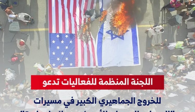 وأكد الحوثي أن اللجنة المنظمة ستحدد باذن الله أماكن المسيرات. وقال، “ندعو جماهير الشعب الباسلة إلى المشاركة العامة لايصال صوته وموقفه كما ندعو أحرار العالم للمشاركة بمسيرات يعبر فيها عن رفض العدوان والحصار الأمريكي وكل ممارساته”.