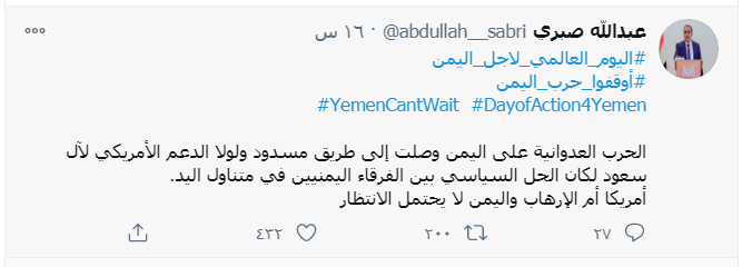 وقال في تغريدة نشرت مساء الأحد، إن ولولا الدعم الأمريكي لنظام آل سعود لكان الحل السياسي بين الفرقاء اليمنيين في متناول اليد. مشددا على أن أمريكا أم الارهاب واليمن لا يحتمل الانتظار.