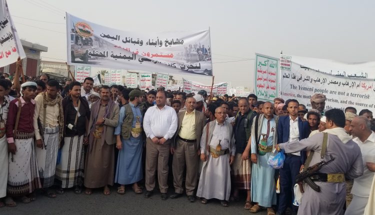 مسيرة حاشدة بمديريات تهامة في حجة للتنديد بالإرهاب الأمريكي