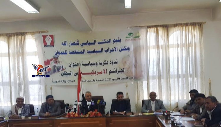 عٌقدت بصنعاء اليوم ندوة سياسية بعنوان الجرائم الأمريكية في اليمن، نظمها المكتب السياسي لأنصار الله وتكتل الأحزاب السياسية المناهضة للعدوان.