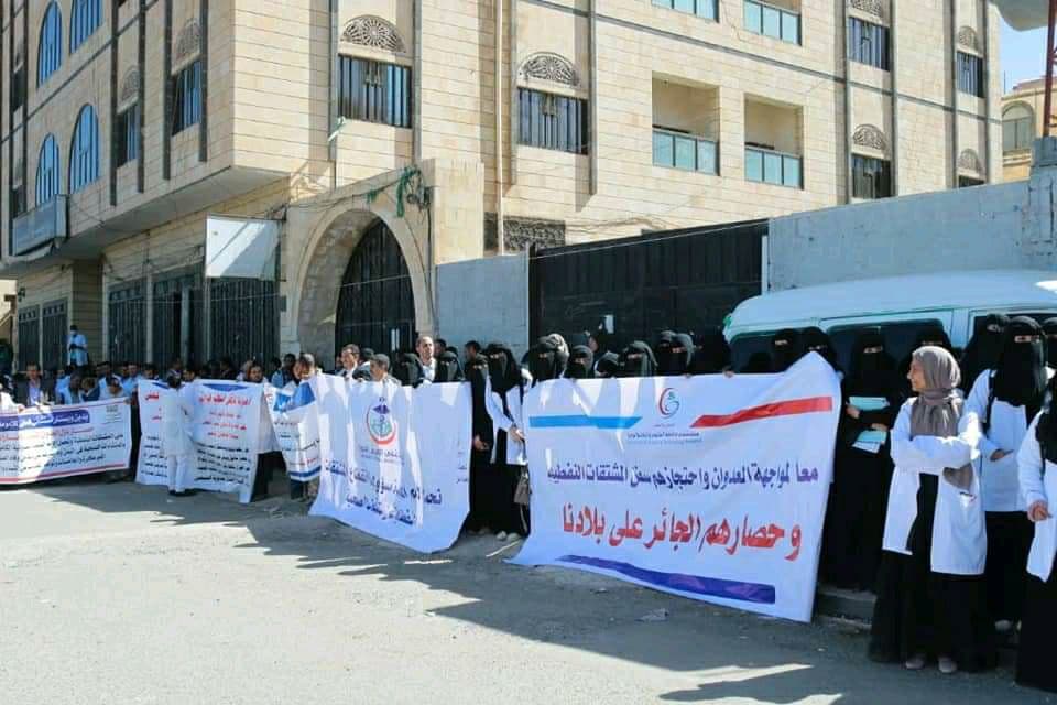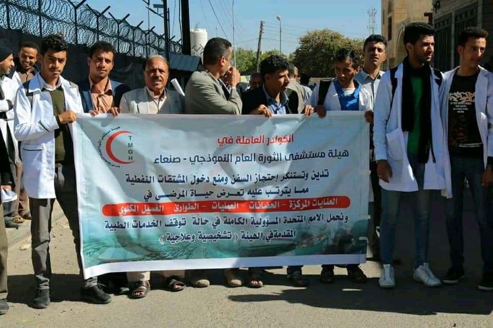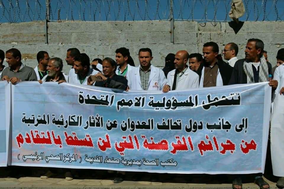نظم القطاع الصحي بأمانة العاصمة صنعاء اليوم الإثنين، وقفة إحتجاجية أمام مكتب الأمم المتحدة بصنعاء للتنديد باستمرار العدوان في إحتجاز سفن المشتقات النفطية.