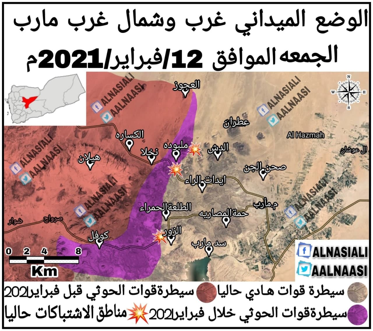 في السياق، نشرت مواقع موالية لتحالف العدوان، خارطة ميدانية توضح المناطق التي سيطرت عليها قوات الجيش اليمني واللجان الشعبية خلال شهر فبراير إلى يوم الجمعة الموافق 12 فبراير.