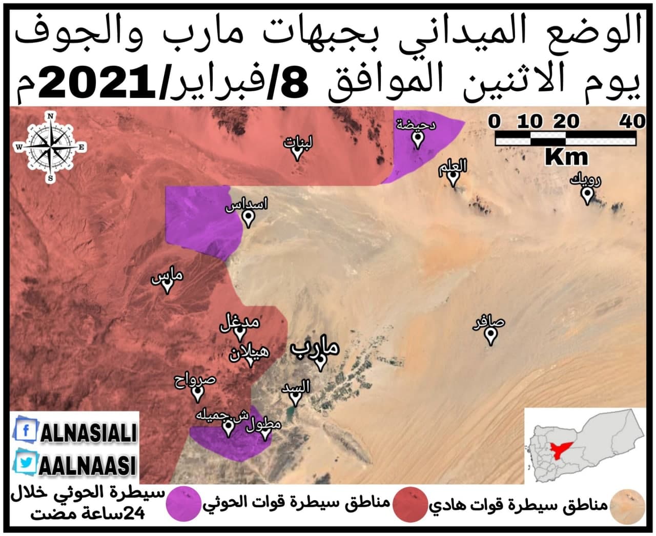 وتظهر الخارطة بالتفصيل المناطق التي سيطر عليها الجيش واللجان خلال شهر فبراير وهي باللون الوردي كما توضح المناطق الخاضعة لسيطرتهما قبل فبراير، والمناطق المتبقية الخاضعة لسيطرة قوى العدوان حالياً ، والأماكن التي تدور بها الإشتباكات حالياً بحسب التوضيح الموجود أسفل الخريطة.