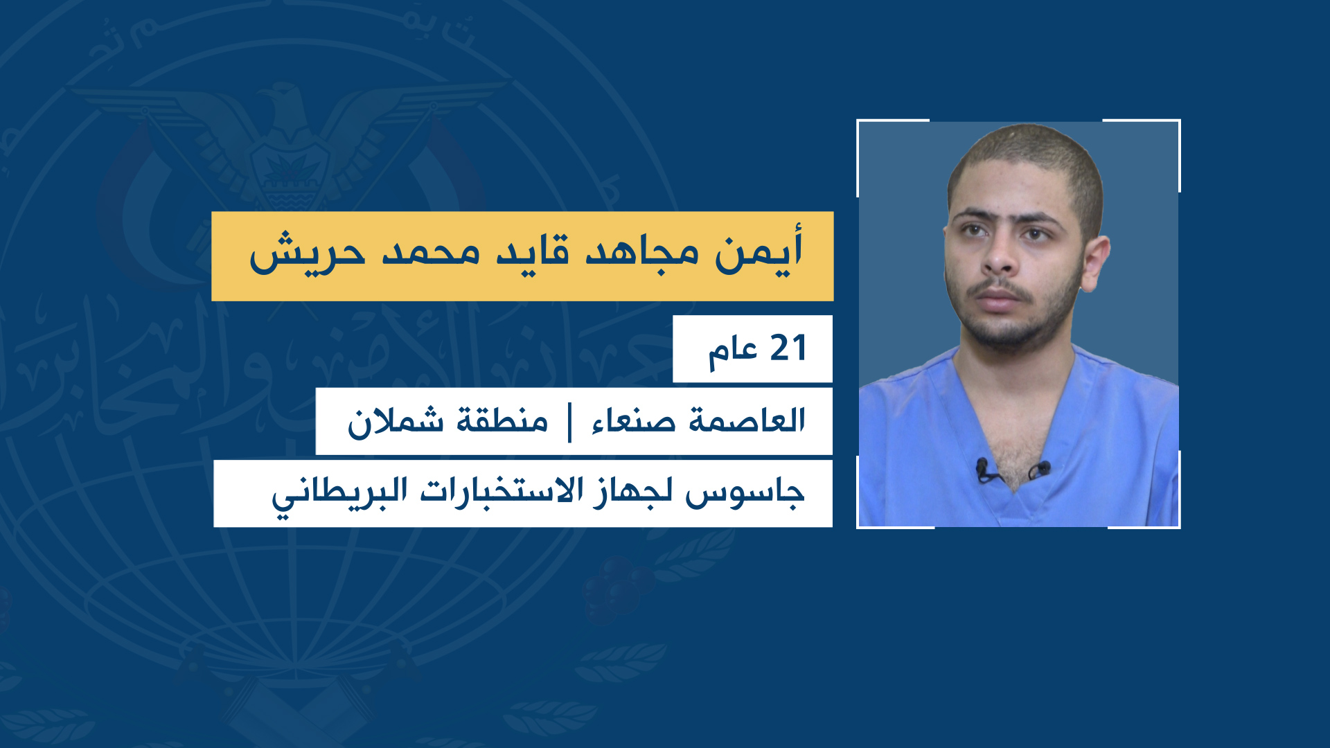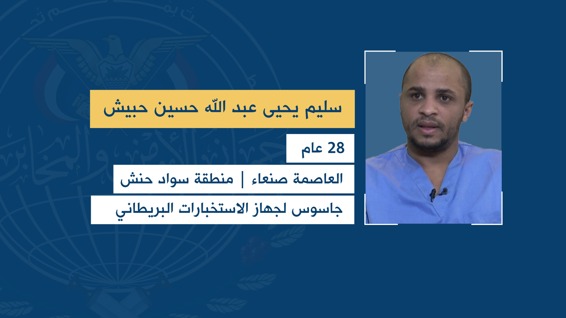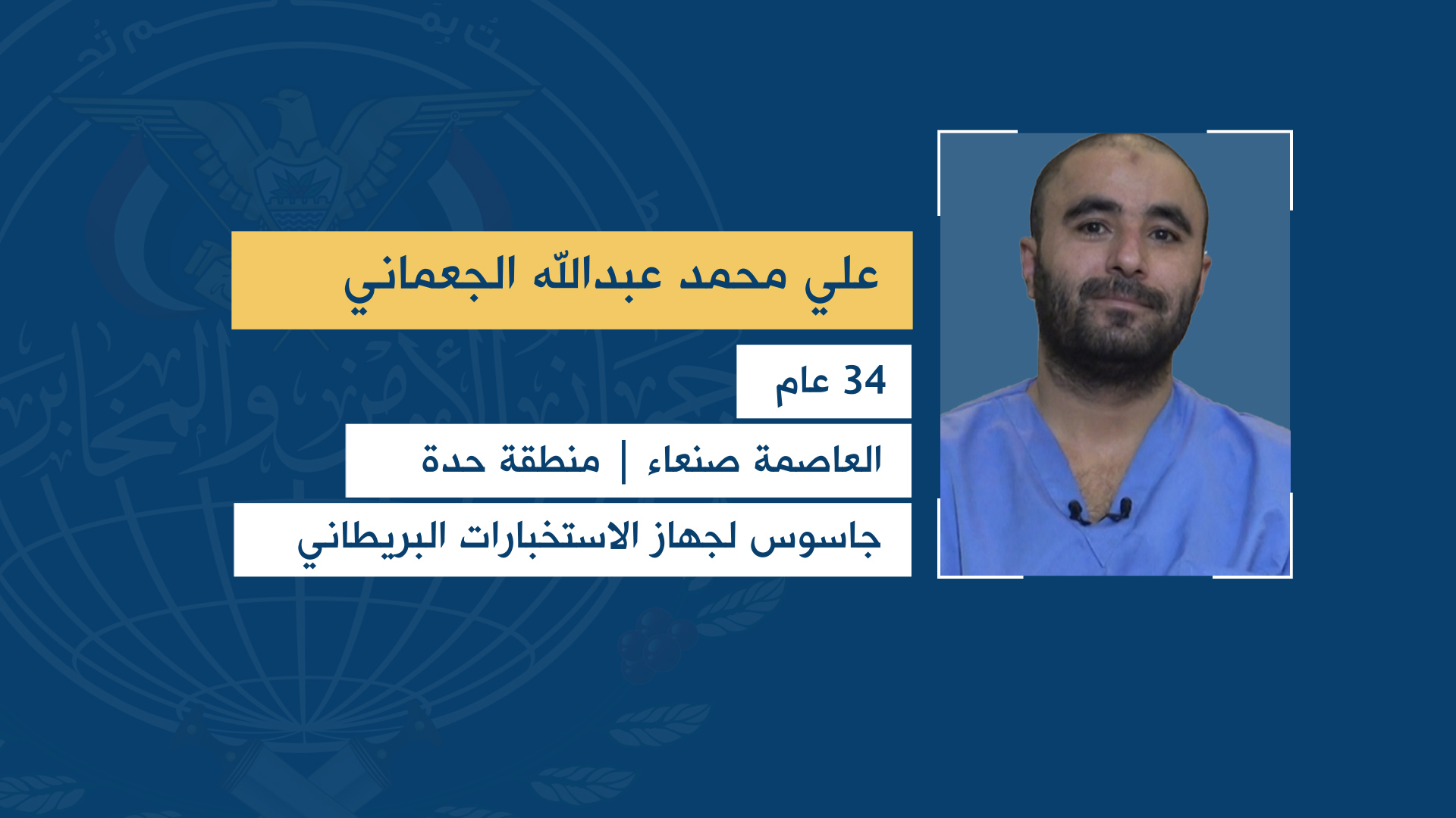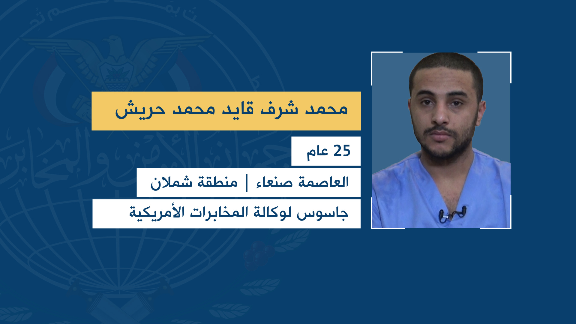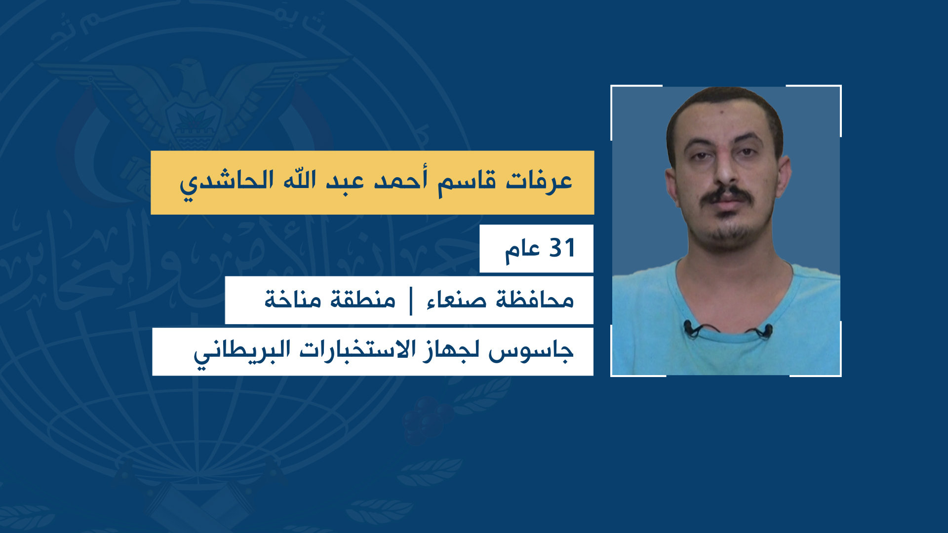 وأفاد جهاز الأمن والمخابرات، أن الجواسيس الستة ينتمون إلى أمانة العاصمة ومحافظة صنعاء وهم: باسم علي علي أحمد الخروجه – منطقة المطار أمانة العاصمة، وعلي محمد عبد الله محمد الجعماني – منطقة حدة أمانة العاصمة، وسليم يحيى عبدالله حسين حبيش – منطقة سواد حنش الأمانة، وأيمن مجاهد قايد محمد حريش – منطقة شملان الأمانة، وعرفات قاسم عبد الله أحمد الحاشدي – منطقة مناخة محافظة صنعاء، ومحمد شرف قايد محمد حريش – منطقة شملان أمانة العاصمة، وهو جاسوس لوكالة المخابرات الأمريكية.
