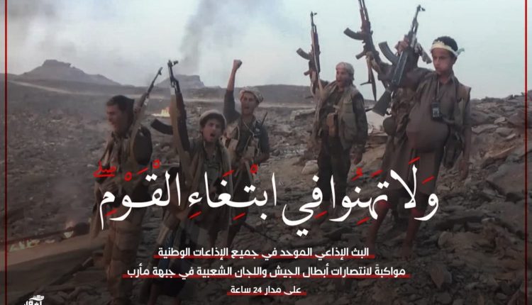 ويعنى البـث الإذاعي الموحد في جميع الإذاعات الوطنية بمواكبة انتصارات قوات الجيش اليمني واللجان الشعبية في معركة تحرير مأرب.