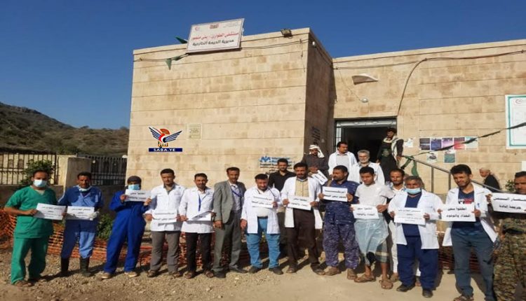 نظم الكادر الطبي وموظفو مستشفى الطوارئ بمنطقة بني منصور مديرية الحيمة الخارجية محافظة صنعاء اليوم وقفة احتجاجية للتنديد بجرائم العدوان واستمرار احتجاز سفن المشتقات النفطية.