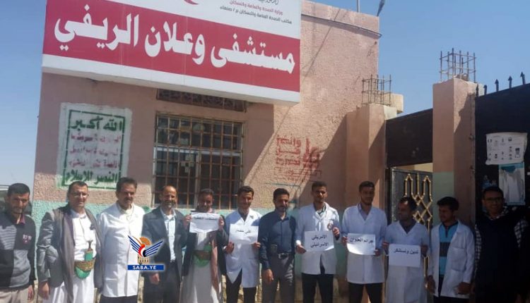 نظم موظفو مستشفى وعلان في مديرية بلاد الروس محافظة صنعاء اليوم وقفة احتجاجية للتنديد بالقرصنة البحرية واستمرار تحالف العدوان الأمريكي السعودي في احتجاز سفن المشتقات النفطية.