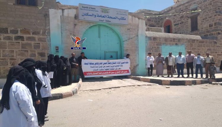نظم مكتب الصحة والقطاع الصحي العام والخاص والكوادر الطبية بمديريات رداع محافظة البيضاء اليوم، وقفة احتجاجية للتنديد بالقرصنة البحرية واستمرار تحالف العدوان الأمريكي في احتجاز سفن المشتقات النفطية.