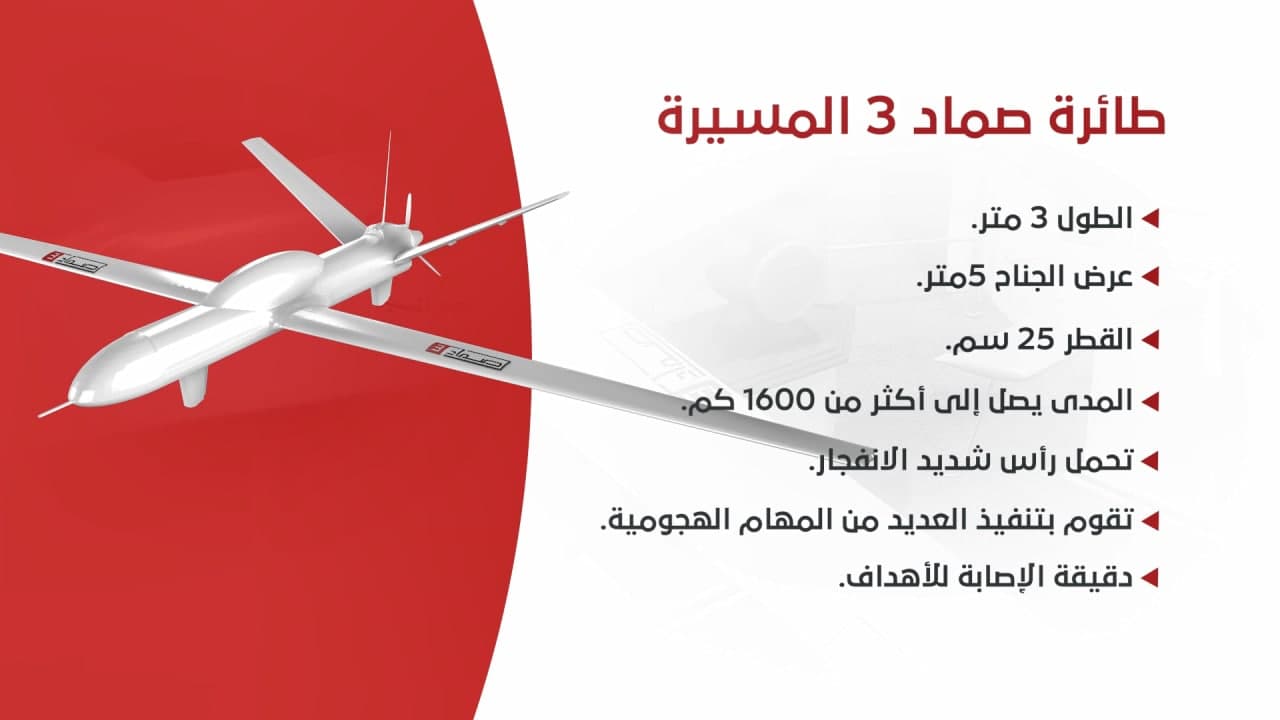 كشف الإعلام الحربي اليمني مواصفات طائرة “صماد 3” المسيرة التي أزاحت الستار عنها القوات المسلحة يوم الخميس، مع عدد من الطائرات المسيرة محلية الصنع في معرض الشهيد القائد.
