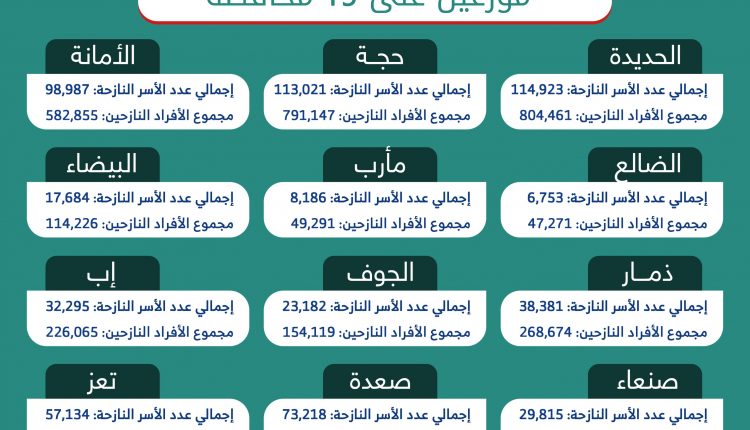 وحسب التقرير بلغ عدد الأفراد النازحين بمحافظة ذمار 268 ألفاً و674، وفي محافظة الجوف 154 ألفاً و119 نازح.