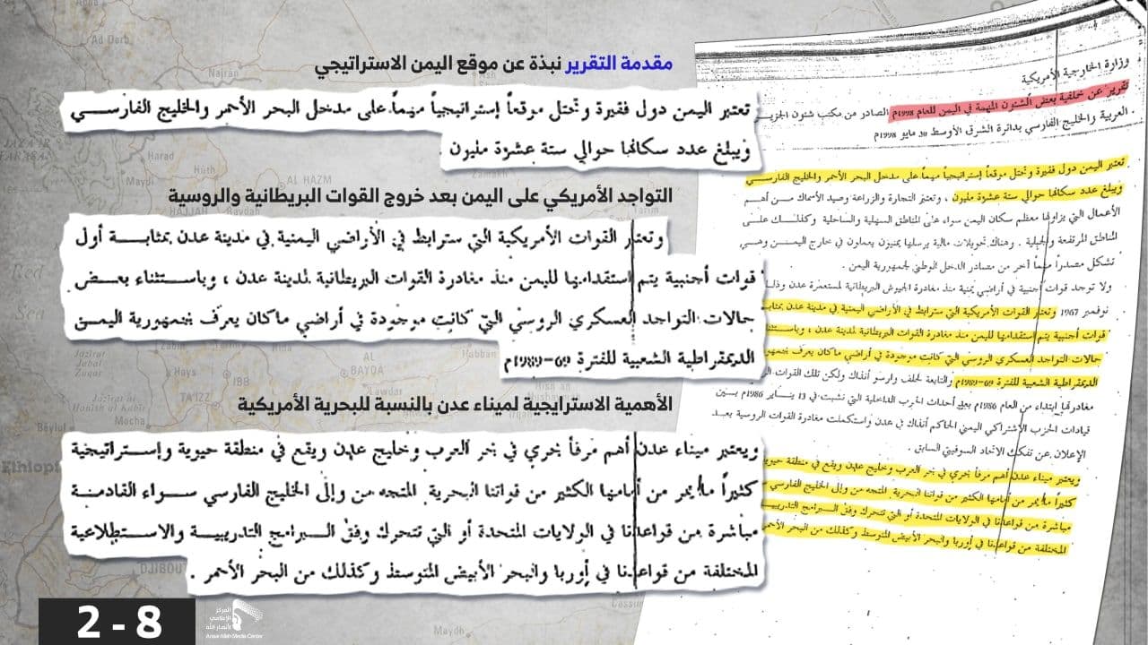 كما تضمن تقرير أحد مكاتب وزارة الخارجية الأمريكية تقريرا عن التفاصيل الجغرافية والديمغرافية والاقتصادية لليمن، إضافة لنظرة عامة عن التواجد العسكري الأجنبي في اليمن.