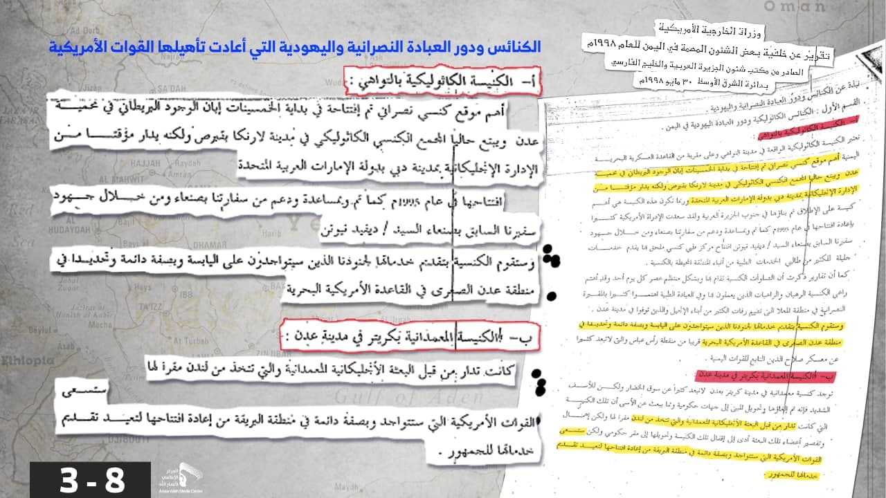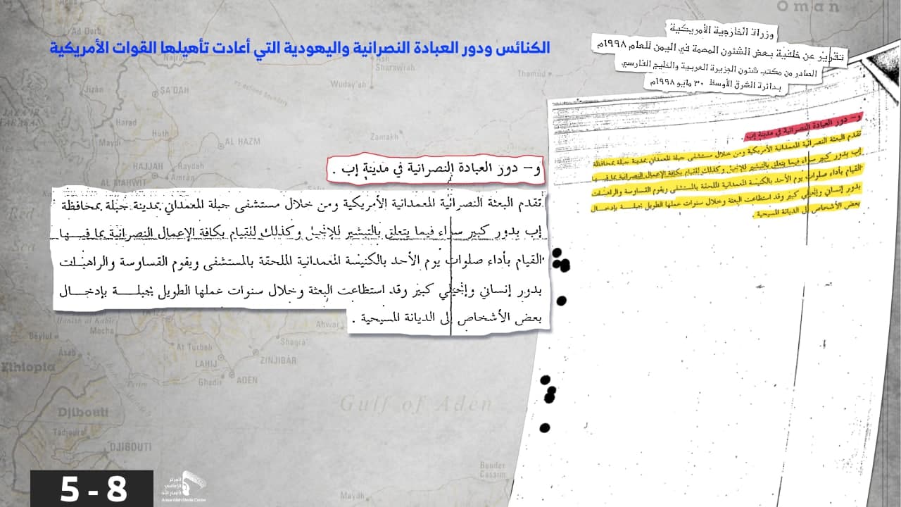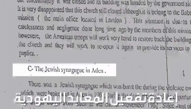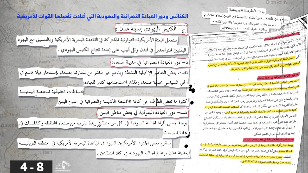 وأكدت دائرة التوجيه المعنوي أن وثيقة الخارجية الأمريكية تتحدث عن إعادة تفعيل المعابد اليهودية والنصرانية، ودور القوات الأمريكية في عدن بحماية أفراد الجالية اليهودية في صعدة وصنعاء.