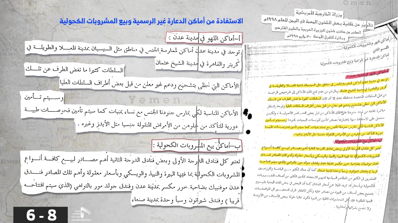 وثيقة الخارجية الأمريكية حددت ايضاً عددا من أماكن بيع المشروبات الكحولية في صنعاء وعدن وتتحدث عن جهات تقوم بتصنيع “البيرة” من مصادر محلية.