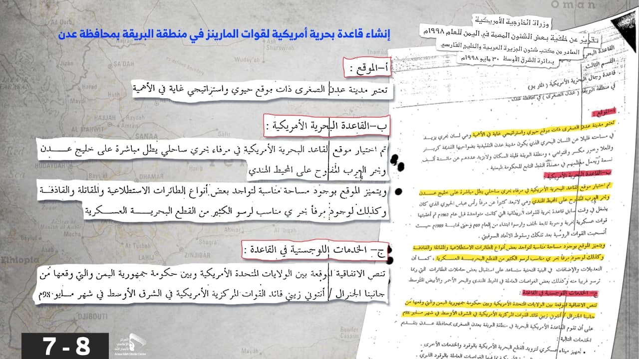 كما نشرت دائرة التوجيه المعني تقريرا لأحد مكاتب وزارة الخارجية الأمريكية الصادر بتاريخ 30 مايو 1998 والذي يتحدث عن إنشاء قاعدة بحرية أمريكية لقوات “المارينز” في منطقة البريقة بمحافظة عدن.