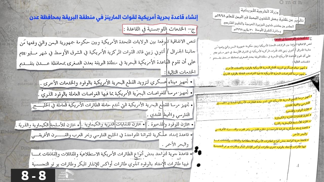 وقال التقرير إن قاعدة القوات الأمريكية في عدن ستتضمن مخازن للوقود وللذخيرة، ومخازن للنفايات والأسلحة الذرية والكيماوية، واعتبرها قاعدة إمداد عسكرية لقواتنا المتواجدة في الخليج وبحر العرب والقرن الأفريقي والبحر الأحمر.