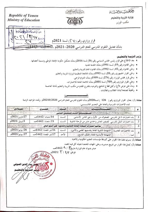 أعلنت وزارة التربية والتعليم في صنعاء تعديل التقويم المدرسي للعام الدراسي الحالي 2020_ 2021م.
