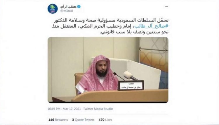 وحمل الحساب في سلسلة تغريدات له السلطات السعودية مسؤولية سلامة إمام وخطيب الحرم المكي صالح ال طالب المعتقل منذ نحو سنتين ونصف السنة بلا سبب قانوني، مؤكدا أن القضاء في المملكة يفتقر إلى الاستقلالية والشفافية والاستئناف، وهو لعبة بيد النظام لتشديد العقوبات على معتقلي الرأي.