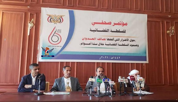 ولفت في المؤتمر الصحفي الذي حضره أمين عام مجلس القضاء الأعلى القاضي أحمد العقيدة ورئيس هيئة التفتيش القضائي القاضي أحمد الشهاري ونائب وزير العدل القاضي سعد أحمد هادي إلى أن العدوان استهدف السلطة القضائية لإعاقة دورها في توثيق الملفات الجنائية الخاصة بجرائم العدوان وعملائه ومحاكمتهم في المحاكم الوطنية والدولية وبما يكفل حفظ الحق العام للوطن والخاص لضحايا العدوان.