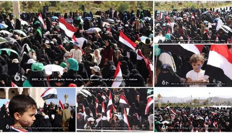 ورفعت المشاركات في المسيرة بساحة جامع الشعب بأمانة العاصمة، العلم الوطني واللافتات المنددة بجرائم العدوان وما يفرضه من حصار على الشعب اليمني منذ ست سنوات.