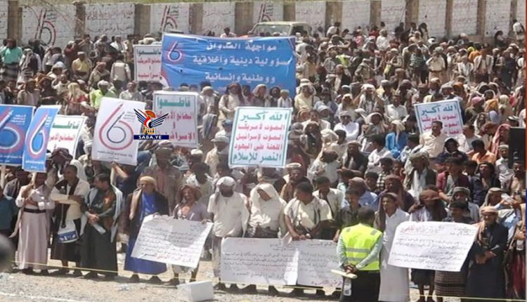 ورفعت الحشود الجماهيرية المشاركة في الساحات العلم الوطني والشعارات المعبرة عن الصمود الأسطوري للشعب اليمني واستمراره في الثبات حتى تحقيق النصر المؤزر.