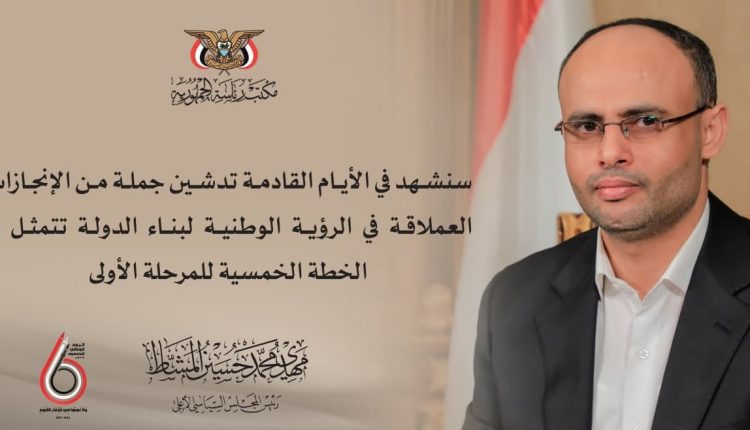 قال رئيس المجلس السياسي الأعلى فخامة المشير الرئيس مهدي المشاط، إنه “سنشهد في الأيام القادمة تدشين جملة من الإنجازات العملاقة في الرؤية الوطنية لبناء الدولة تتمثل في الخطة الخمسية للمرحلة الأولى”.