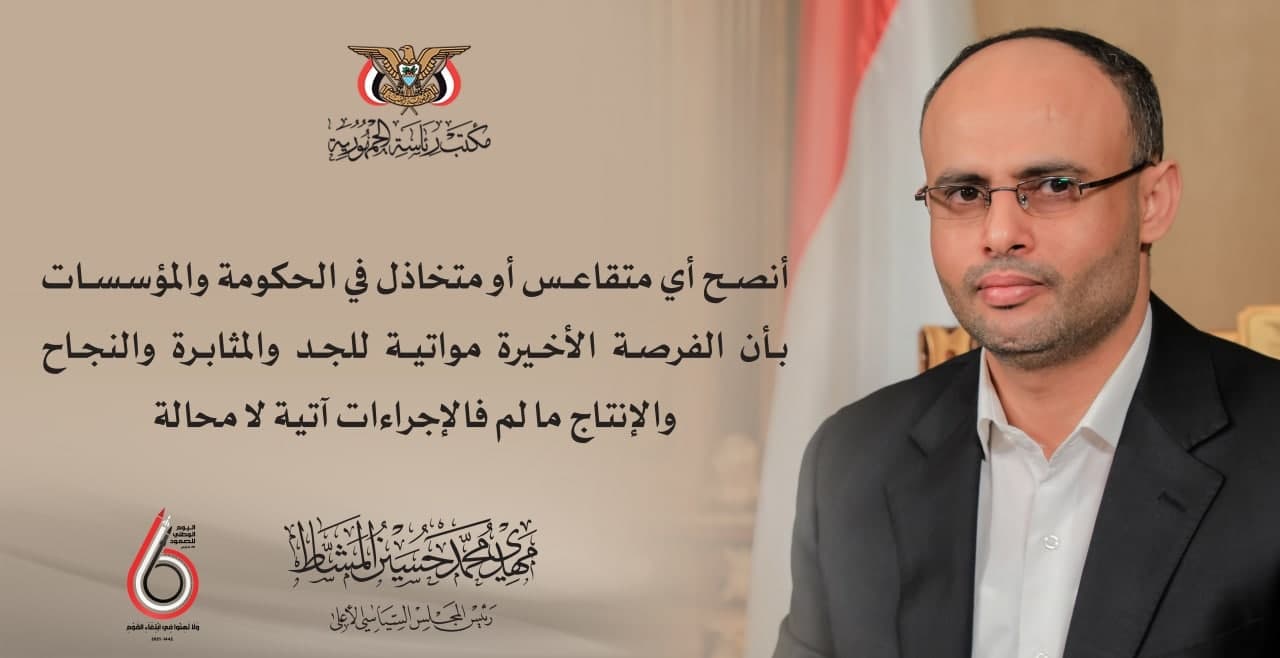 وتقدم الرئيس المشاط، في كلمة لهُ بمناسبة اليوم الوطني للصمود، بالنصح إلى كل متقاعس أو متخاذل في الحكومة والمؤسسات بأن الفرصة الأخيرة مواتية للجد والمثابرة والنجاح والإنتاج ما لم فالإجراءات آتية لا محالة.