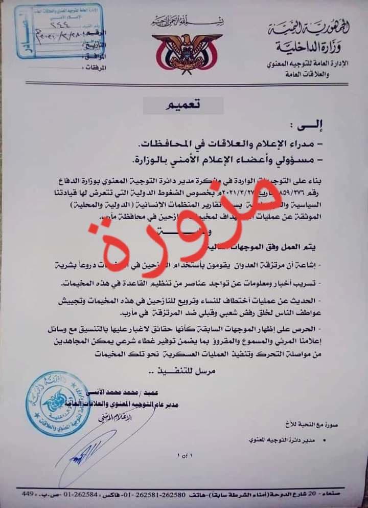 وقال ناطق وزارة الداخلية أن وسائل إعلام العدوان وأبواقه الرخيصة – كعادتها في نشر الشائعات، والأكاذيب المفضوحة بشكل يدعو على السخرية -؛ عمدت على الترويج لمذكرة قاموا بتزويرها باسم الإدارة العامة للتوجيه والعلاقات العامة في وزارة الداخلية صنعاء .